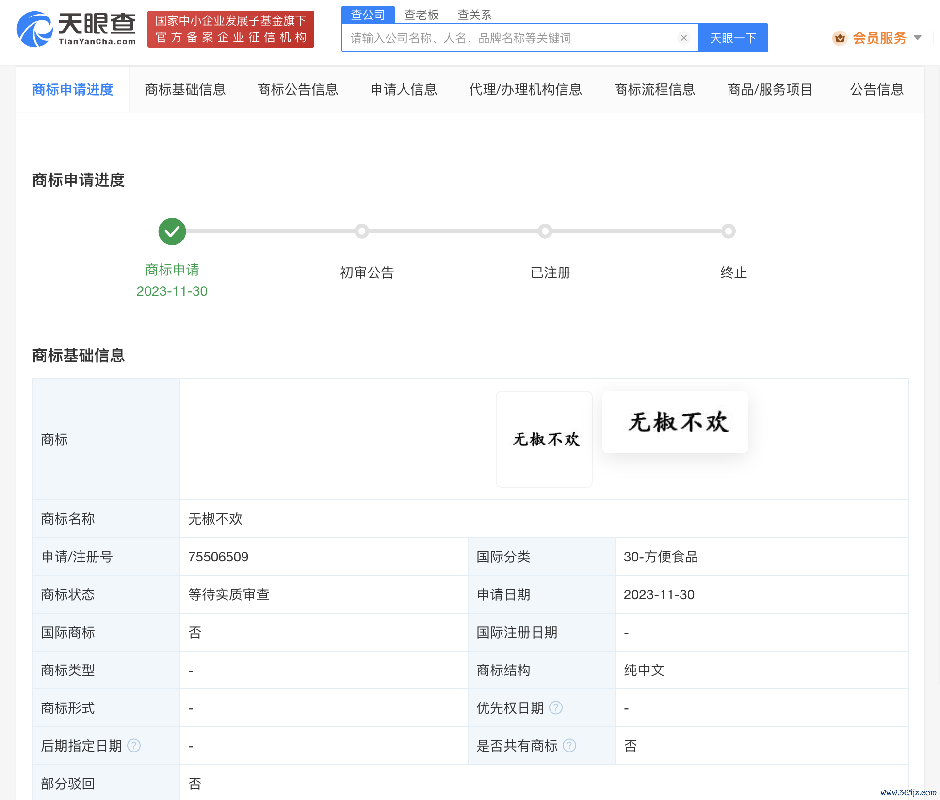 天眼查App显现,近日,一米八食物科技(浙江)有限公司请求注册一枚“无椒不欢”商标,外洋分类为便捷食物,现时商标景况为恭候试验审查。